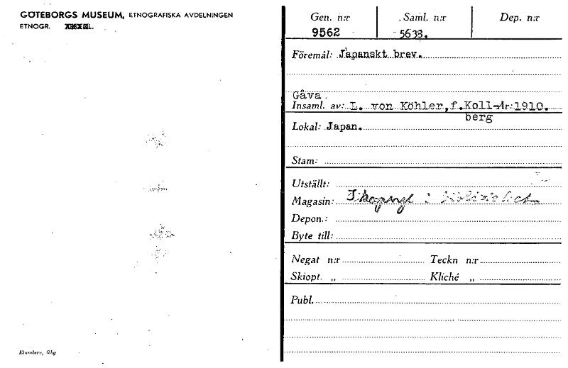 GOTEBORGS MUSEUM, ETNOGRAFISKA AVDELNINGEN ETNOGR. »MIL. Ehorriore, Gby Gen. n:r 9562 - 1 ,Sam!. n:r - 5638. 1 Dep. n:r Föremål: .J.4painkt...br.ey. Gåva , Insaml. av: T e "On- -naller rfeK011-24r: ...