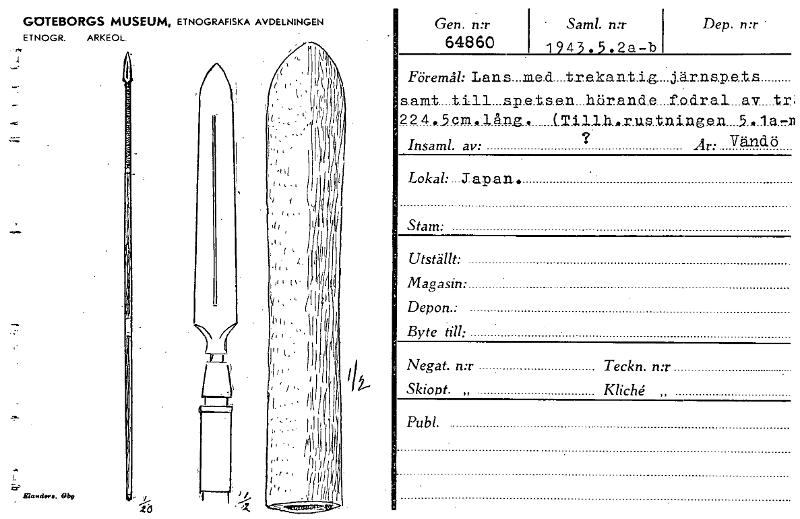 • GOTEBORGS MUSEUM, ETNOGRAFISKA AVDELNINGEN ETNOGR. ARKEOL. • Samt. n:r 1943.5.2a-h Dep. n:r Gen. n:r 64860 a Föremål: La ns....me.d....tra ka samt till .sp.e.t.s.e.n. hör.an.d.e. .f.o.dr.a.l. a.v trj... Visa hela