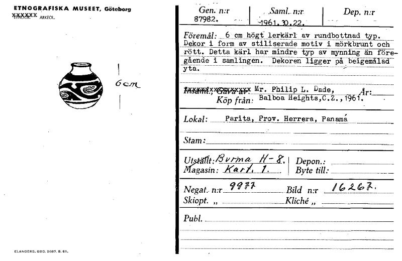 ETNOGRAFISKA MUSEET, Göteborg VKIWX ARKEOL. ELANDERS. GBG. 5687. B. SI. Gen.- n:r 87982.I , _Saml._ n:r I Dep. n:r Föremål: 6 cm högt lerkärl av rundbottnad typ. Dekor i form av stiliserade motiv i mörkbrunt och rött. Detta kärl har mindre typ av gående i samlingen. Dekoren ligger yta. impwnsupyw Mr. Philip L. bade, Köp från: Balboa Heights,C.Z.,1961. mynning än före på beigemålad--- Ar: Lokal: Parita, Prov. Herrera, Panamå. Stam: 4ståltt:g vi-Ma, il(' 8; Depon.: Byte till: Magasin: A-4,, 1. Ma 2f Negat.. n:r_ 99" Skiopt. „ Kliché,, Bild n:r Publ. , [ocr]