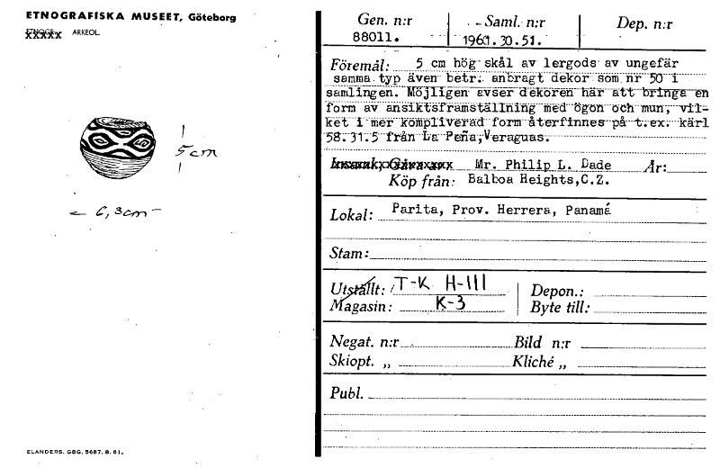 ETNOGRAFISKA MUSEET, Göteborg 5866tx ARKEOL 47/ 34-rrt ELANDERS. GBG. 5607.0. 61. Gen. n:r 88011 • - - . ..Saml -wr I -1960.30:51.. -1 Dep. n:r Föremål: 5 Cm hög- skål av lergods- samma. typ även- betr:. anbragt d-ekor samlingen. Möjligen- avser dekoren form av ansiktsframställning med ögön k ''' i - mer kompliverad form-återfinnes-på- -58-.--31-3---från La-- Peii-a,-Veraguas. lusurakpaålnixxxx Mr. Philip 1. Köp från: Balboa Heights , av- ungefär - som. nr 50i har att rringa et öch-mun , -v-il3; t--:-ex. kä-r-1 Lade Är: C . Z. Lokal: Pari-ta, Prov. Herrera, Panam. Stam: Ut lt: /T-K. H- i I Magasin: 1---(13— Depon.: Byte till: Negat. n:r_ Bild n:r Skiopt. „ KlicU „ Publ. _ _ [ocr]Stäng