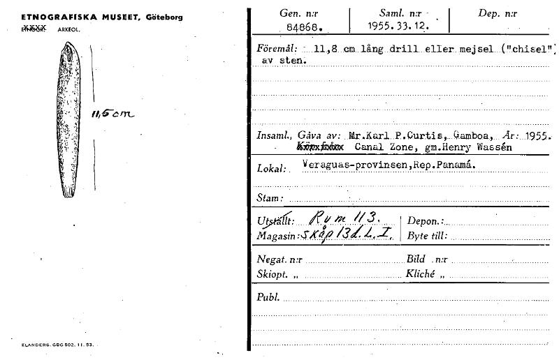 ETNOGRAFISKA MUSEET, Göteborg E4W ARKEOL. Gert. n:r . 84868. . Sam!. nr - Dep. n:r 1955. 33. 12. • Föremål: - 11 .8...cm..lång..drill...elIer..mejs.el...e.chisel!': av sten. Fl, 5—c nu Insaml., Gåva av: Mr.Karl P.Curtis, Gamboa, År: 1955. ijpXVX Canal Zone, gm.Henry Wassen Lokal: Verague.s-provinsen,Rep.Panamå. Stam: Uj 7i: //3, Magasin:4'42 /31 Å 2: Depon.: Byte till: Negat. n:r Bild .n:r Skiopt. „ Kliché„ Pub!. ELANDERS, 000 502. Il. 53. [ocr]