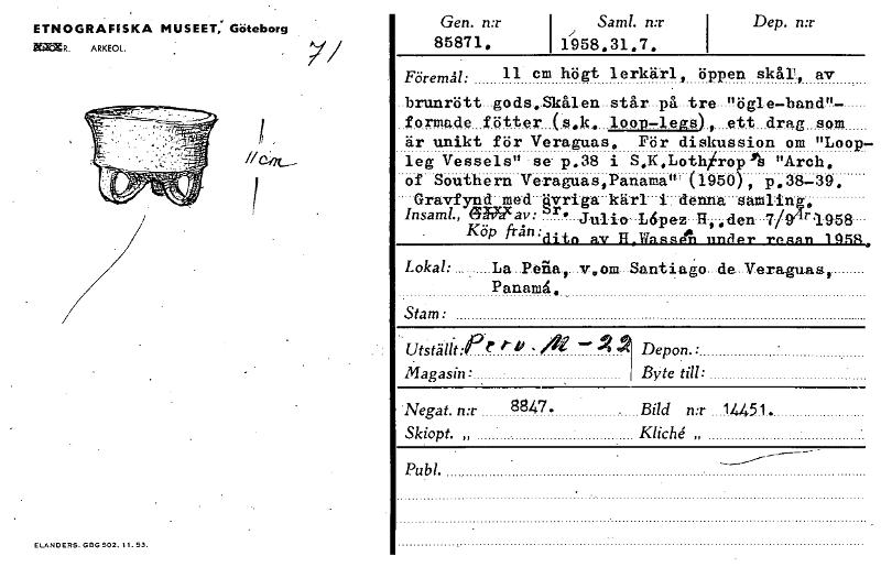 • / ETNOGRAFISKA MUSEET: Göteborg NaragR. ~ML ELANDERS. GOG 502. 1.53. Gen. n:r 85871, Samt. n:r i 1958,31,7, i Dep. n:r Föremål: 11 cm högt lerkärl, öppen skå1., av ..brunrött..gods„.Skålan._står..på-... Visa hela