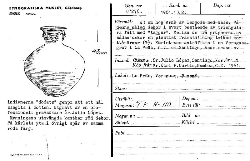 ETNOGRAFISKA MUSEET, Göteborg 030C4 ARKEOL. -443G/71 indianerna "dödats" genpm att ett hål slagits i botten. Utgrävt av en pro- fessionell gravsökare Sr.Julio Lcipez. Mynningens utsvängda kanthar röd ...