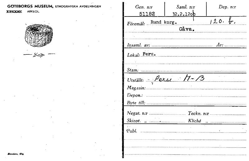 • GOTEBORGS MUSEUM, ETNOGRAFISKA AVDELNINGEN xgnocex ARKEOL. itS/c.,› Hbe Gen. n:r 51182 Saml. n:r i 32.2.1213 Dep. n:r Föremål: Rund korg. J .2. 0 • t- , . Gåva. Insaml. av: År: Lokal: Peru. Stam... Visa hela