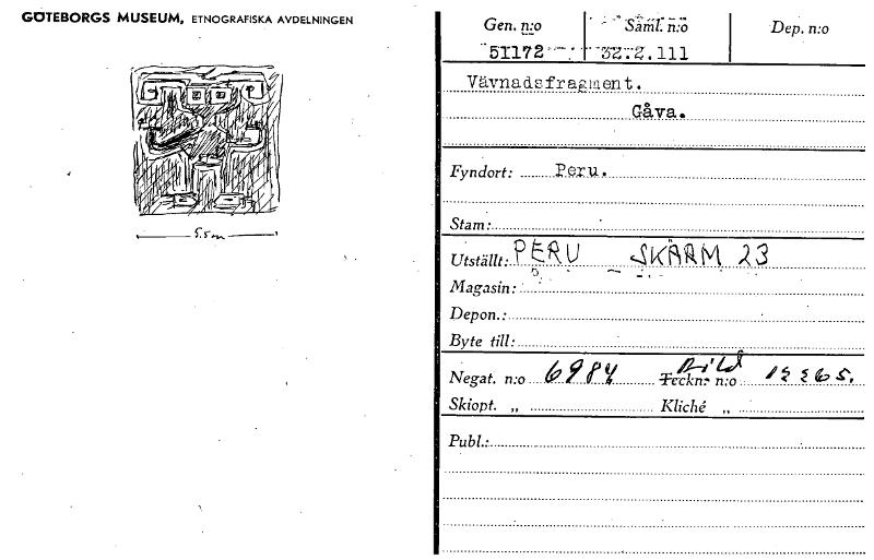 • GOTEBORGS MUSEUM, ETNOGRAFISKA AVDELNINGEN Gen. nio Sinir -51172-1-3"47Z.111 Vävnadsfragment. Gåva. Fyndort: per u • Stam • Dep. n:o utstäut: P CR U M ,2 3 , Magasin: Depon.: Byte till: Negat: n:o .... Visa hela