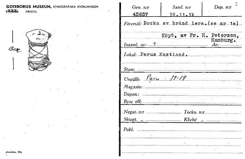 Gen. mr Saml. n:r 45857 30.11. lb Dep. n:r GOTEBORGS MUSEUM, ETNOGRAFISKA AVDELNINGEN E•419512. ARKEOL. Docka av bränd lera. (se nr la)._ Köpt, av Fr. H. Petersen, Hamburg. Insaml. av: Lokal:. Rer.u...
