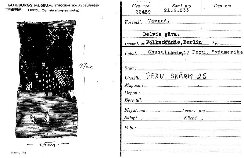 277, Gen,..n:o- 22459, . Saml. mo 21.6.233 . Dep. n:o Föremål: Vävnad. Delvis gåva.. .Ber1 Insaml. avgölke 2215111 -el Är: . Lokal: Chuqui taiittra Pern,,- Sydamerik -• Stam: Utställt: 'PER 1/ SKA...