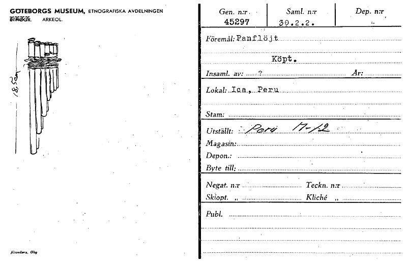 • GOTEBORGS MUSEUM, ETNOGRAFISKA AVDELNINGEN Wsää. ARKEOL. 0,4N Gen. n:r. 45297 Sam!. n:r 39 . 2 . 2 . Föremål: P.enflöj t Köpt. Insaml. av: 9 Lokal:a Stam: Peru Utställt: Magasin: Depon.• Byte till:... Visa hela