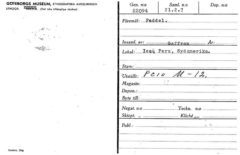 GOTEBORGS MUSEUM, ETNOGRAFISKA AVDELNINGEN ETNOGR. Maga. (Det ieke tillämpliga strykes) • • <Sy..;,$ ,71,t , Elanders, Gbg Gen.. no 22094 Sam!. mo 21.2. 7 Dep. n:o Föremål: Pasic1.0.1... Insaml. av: Gn-f-greyrt År: Lokal: Ic44 Peru, Sydamerika. Stam: . 'Utställt: e t I/ ,d, Magasin: Depon.• Byte till: Negat. mo 'Teckn. n:o Skiopt. „ Kliché,, Pub!.: _ [ocr]