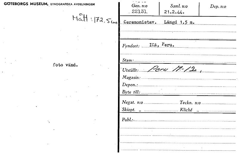• GOTEBORGS MUSEUM, ETNOGRAFISKA AVDELNINGEN . — Gen. n:o Samt. n:o 22131_ 21..2.44. Ceremonistav. Längd 1.5 m. Dep. n:o Fyndort: ICA, Peru. foto vänd. Stam • 'Utställt: 77-7--22 Magasin: Depon.: Byte ... Visa hela