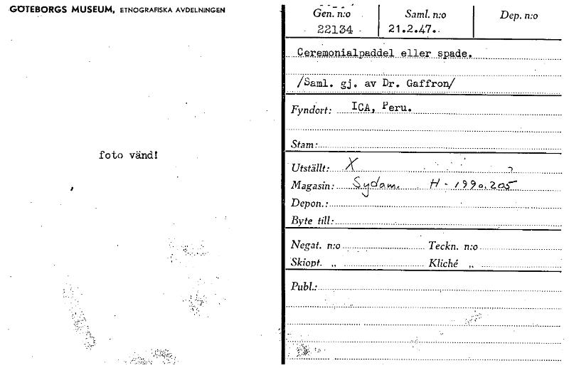 • GOTEBORGS MUSEUM, ETNOGRAFISKA AVDELNINGEN Gen. n:o - 22134 Sam!. n:o 21.2.47.. Dep. n:o Ceremonialpaddel eller spade.1 /Saml. gj. av Dr. Gaffro Fyndort: ICA, peru, foto vänd! Stam • UtStällt •.x. 9 ... Visa hela