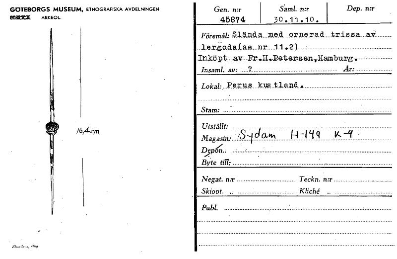 • Elunaers, Gbg Gen. n:r 45874 Sa ml. n:r 1 30 .11.10 . Dep. n:r Föremål: Slända mea orner.e..d tri.s.s.a. av. ...le.rgio.ds..(.s.e.. n.r 11.2) ' Inköpt _av...Fr.11.-PetersenvIlamburg. Insaml. av: ? ... Visa hela