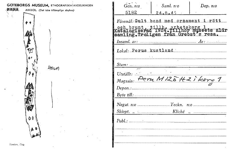 GOTEBORGS MUSEUM, ETN0GRAFIsKMAvDELN:NGEN •,IMITC.J. ARKEOL. (Def icke tillämpliga strykes) Elanders, Gbg 5182 Saml. n:o 4.8 45 Dep. wo ' Föremål: Gult band. med ornament i -rätt oph_bryAnt , _t Ulk....