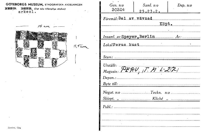• GOTEBORGS MUSEUM, ETNOGRAFISKA AVDELNINGEN XDECOCSR. PXYZEZL. (Det icke tillämpliga strykas) arkeol. Elznders, Gbg _ .. Gen. n:o 30324. Sam!, no 2 5 .2 3 . 2 . Dep. mo Föremåhp.e.l. a.v vävnui Köpt. I... Visa hela