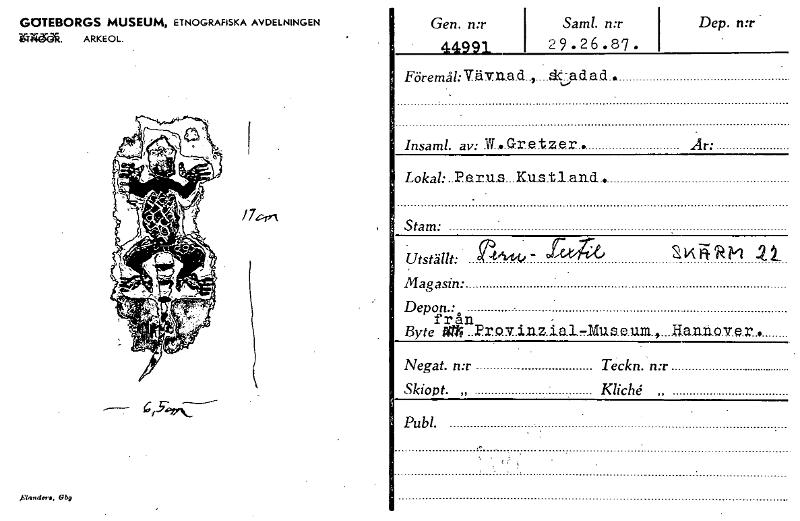 • GOTEBORGS MUSEUM, ETNOGRAFISKA AVDELNINGEN leTT4». ARKEOL. Gen. n:r 44991 Saml. n:r 29.26.87. Dep. n:r Föremål: Vävu.a.d..,....ad a.d... Insaml. av: W...G.r.e.tzer • År: Lokal: ..P.e.r.u.s...K.u.s.t.... Visa hela