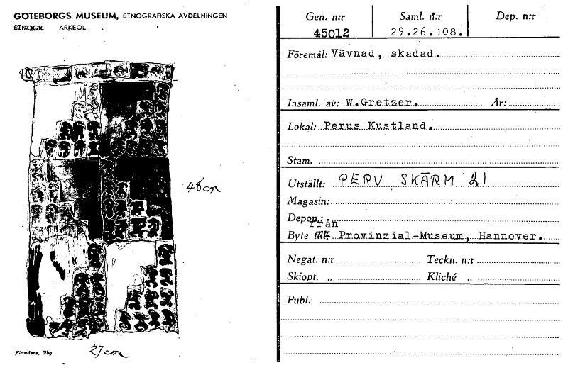 • Gen. n:r 45012 Sam!. rt:r 29.26.108. Dep. n:r GOTEBORGS MUSEUM, ETNOGRAFISKA AVDELNINGEN gmaGje ARKEOL. Akx4dors, Giv Föremål: Vävnad , skadad. Insaml. av: .14...G.r.at.z.e.r • År: Lokal: ..2.e.r.u.s... Visa hela