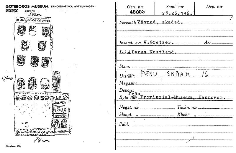 • GOTEBORGS MUSEUM, ETNOGRAFISKA AVDELNINGEN • äkTraX. ARKEOL. Gen. n:r 45053 Sam!. n:r 29.26.146. Dep. n:r r ~MO „2:39 zi;" • tfe, cyrk. Insaml. av: .W....Gr.e.t.z.e.r • År: LokaliPer.u.s...Kus.t.lan... Visa hela