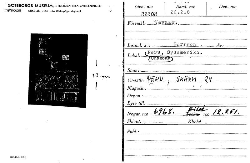 _ GC1TEBORGS MUSEUM, ETNOGRAFISKA AVDELNINGEN -1.T3E—ittlajt."ffi ARKEOL. (Det icke tillämpliga strykes) Elanders, Gbg Gen. n:o 232.2 — . .. .. Samt. n:o I 22.2.8 . Dep. mo Föremål:-Väirm....4-c1.7.. Insaml. av: - Gaffron . .år: Lokal: Peru, Sydamerika. iffiZliap Stam: Utställt: NOV gket%)1 9 f-- Magasin: - • . _ Depon.: Byte till: k-iibli, jo g.- ri Negat. n:o bfi, r, ...xeekft, n:o ' ". 4- — • Skiopt. „ Kliché „ Publ.: 3 "3 [ocr]