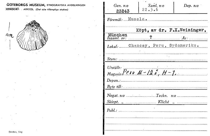 dOTEBORGS MUSEUM, ETNOGRAFISKA AVDELNINGEN infiZGan ARKEOL. (Det Icke tillämpliga strykes) Elanders, Gbg Gen. n:o 23243 gam. 1. mo 22.3.6 Dep. mo '- Föremål: Mussla. rcipt, av dr.. F.X.Weizinger, run...