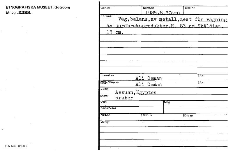 • ETNOGRAFISKA MUSEET, Göteborg Et nogr . 11/40101. RA 588 81-03 Gen.nr Saml.nr 1(985.8.30a—c I Dep.nr I Föremål Våg,balans,av metall,mest för vägning av jordbruksprodukter.H 83 em-Skåldiam• 13 cm. Insa... Visa hela
