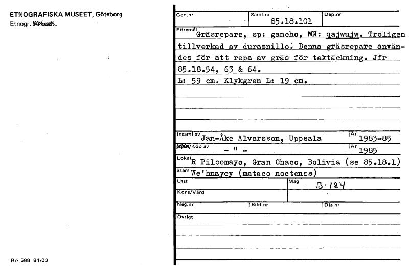 ETNOGRAFISKA MUSEET, Göteborg Et nog r . 141bettK RA 588 81,03 Gen.nr Saml.nr I 85.18.101 I Dep.nr FommM Gräsrepare, ap: gancho, ]VIN: qajwujw. Trolige tillverkad av duraznillo: Denna gräsrepare använ Jfr des för att repa av gräs för taktäckning. 85.18.54 63 & 64. L: 59 cm. Klykgren I: 19 an. insami avÅ Ar IJan— ke A Ivars son Uppsala 1983-85 tilje4E/ K öp av ... ie .. i Ar 1985 "kalit Pilcomayo Gran Cha co I Bolivia ( se 85.18.1 ) Stam me w 'hnayey (mataco noctenes) Unt Mn f3. i 8 I Kons/Vård Neg.nr t Bild nr TDia nr Övrigt [ocr]Stäng