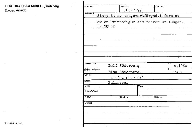 • ETNOGRAFISKA MUSEET, Göteborg Etnogr. Arks« RA 588 81-..03 Gen.nr Saml.nr 86.7.72 Dep.nr Föremål Statyett av trälsvartfärgad,i form av av en kvinnofipur som ränker ut tu p-an H. 20 cm. Insaml av Leif ... Visa hela