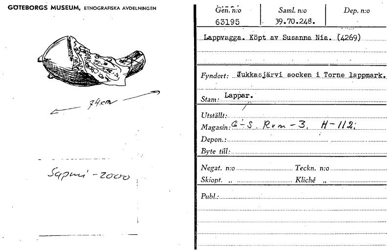 • GOTEBORGS MUSEUM, ETNOGRAFISKA AVDELNINGEN Sam!. 39.70.24.8. Dep. n:o 63195 r Fyndort: Jukkasjärvi socken i Torne lappmark. Stam Lappa. - / Utställt • MagasinL -3, 11- Depon.: Byte till: Negat. n:o... Visa hela
