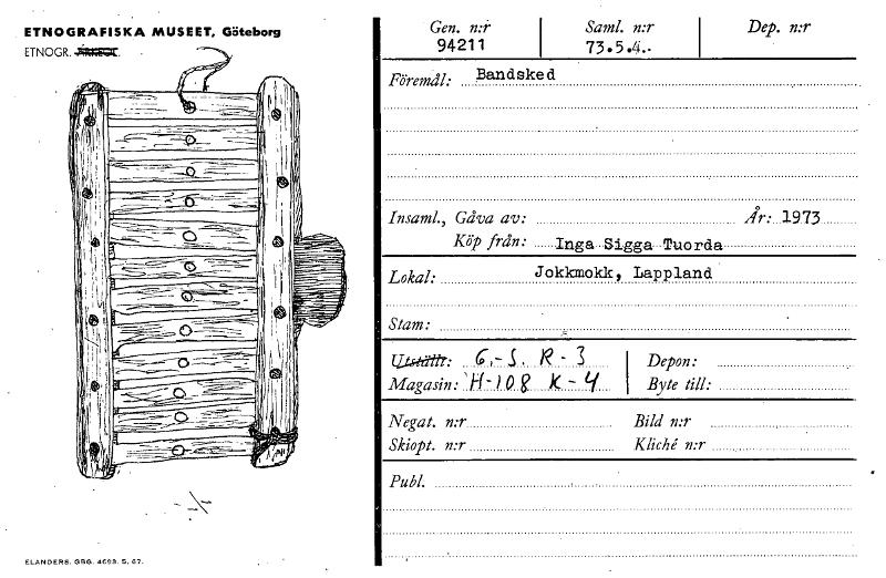 • Köp från: Inga Sigga Tuorda Lokal: Jokkmokk 9 Lappland Dep. n:r Föremål: Bandsked Insaml., Gåva av: Ar: 1973 Stam: ~er: ‘,- - 3 Depon: Magasin:' H- )og k-q i Byte till: Negat. n:r Bild n:r Skiop... Visa hela