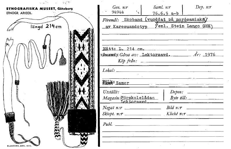 • ETNOGRAFISKA MUSEET, Göteborg ETNOGR. ARKEOL. ELANDERS. GBB. 1972. Gen. n:r 94944 , Saml. n:r I 76.6.5 a-b Dep. n:r I Föremål: Skoband vutiddat °å ordsamisk av Karesu.andotyp /enl. Stein Lang° GEM) Må... Visa hela