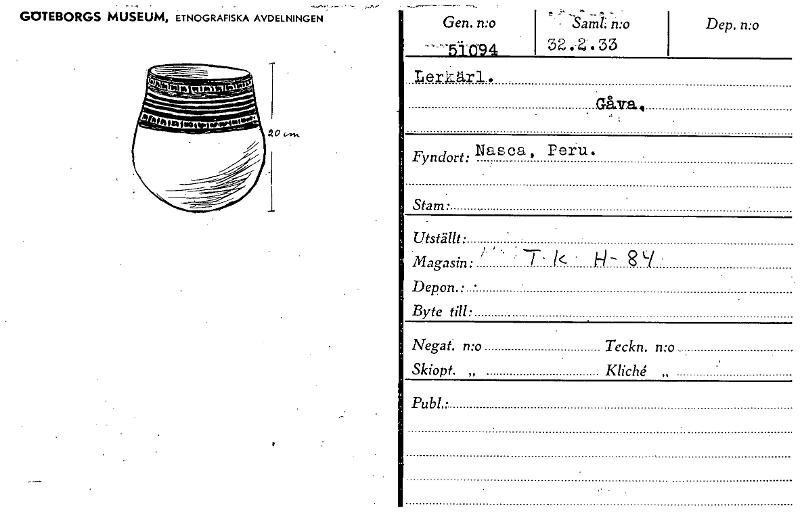• GOTEBORGS MUSEUM, ETNOGRAFISKA AVDELNINGEN ,, - Saml: n:o 32.2.33 Dep. n:o Gåva, Fyndort: Nas ca , Peru. Stam • Utställt • ' Magasin: T. k-/- L/ Depon.: • Byte till: Negat. n:o Teckn. n:o Skiopt. „... Visa hela