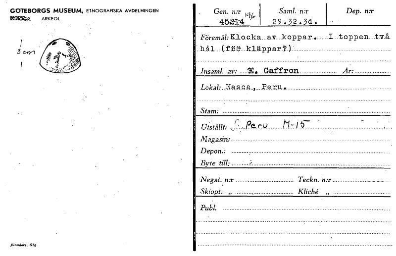 • GOTEBORGS MUSEUM, ETNOGRAFISKA AVDELNINGEN YTTMR. ARKEOL. Dep. n:r Gen. n:r Hk 45-214 Saml. n:r 29 .32 . 3d . Föremål: K.lo.c.ka...av....k.o.p.p.a.r... I. toppen....tv.å. Insaml. av: 'E.. Gaffr.on Lo... Visa hela