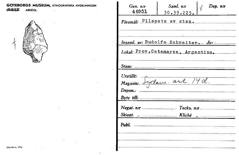 GOTEBORGS MUSEUM, ETNOGRAFISKA AVDELNINGEN arifaitX ARKEOL. Danders, <ng Gen. n:r 46951 Saml. n:r i 30.39.225. il- Dep. n:r i Föremål: .Pilspets av sten , Insaml. av: Budrol.f.o....S.c.hrette.r.... Ar...