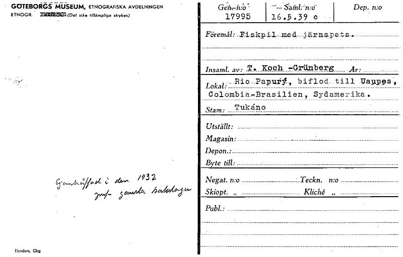 • GOTEBOlidg II-USEUM, ETNOGRAFISKA AVDELNINGEN ETNOGR. mearama(Def icke fillämpliga sfrykes) /932 rwkeA Elanders, Gbg Ge-h: o - 17995 ---Staln:o- ---Staln:o-16 .5 . 39 c Dep. n:o Föremål: ..F.i.skpl,2....raed järnapets.. Insaml. av. T. Koch..rGr(inberg År: Lokal:-- .Rio..Papux9., biflod...till Zaupes , ColombiaBrasilien, Sydamerika. Stam: Tukåno Utställt: Magasin: Depon. • Byte till: Negat. n:o . Teckn. n:o Skiopt. „ Kliché „ Pub!.: [ocr]