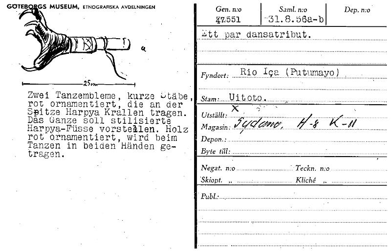 • Zwei Tanzembleme, kurze ;Jtäbe rot ornamentiert, die an der Spitze Harpya Kral1en tragen. Das Ganze soll stilisierte Harpya-FUsse vorstellen. Holz rot ornamentiert, wird beim Tanzen in beiden Händen g... Visa hela