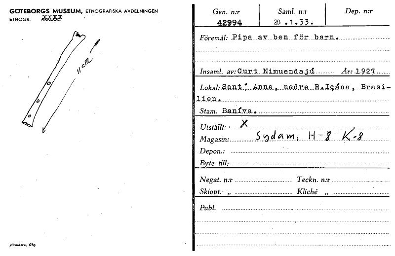 • Gen. n:r Samt. n:r 42994 ffi .1 . 33 • Dep. n:r GOTEBORGS MUSEUM, ETNOGRAFISKA AVDELNINGEN ETNOGR. ARUS2c Föremål: lpipa av ben för barn. Insaml. av: Cur.t Nimuenda Är: 1927 Loka/...Sent Anna , nedre... Visa hela