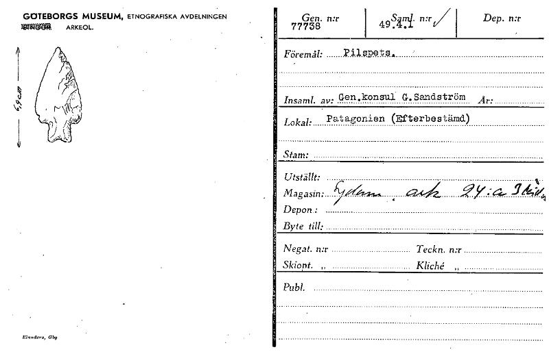 • GOTEBORGS MUSEUM, ETNOGRAFISKA AVDELNINGEN ~Sia ARKEOL. Gen. n:r 77738 49S.d. n:r Dep. n:r Föremål: Pilspets, Insaml. av. • Gen.konsul G.Sandström Lokal: Patagonien (Efterbestämd) Stam: Utställt: Mag... Visa hela