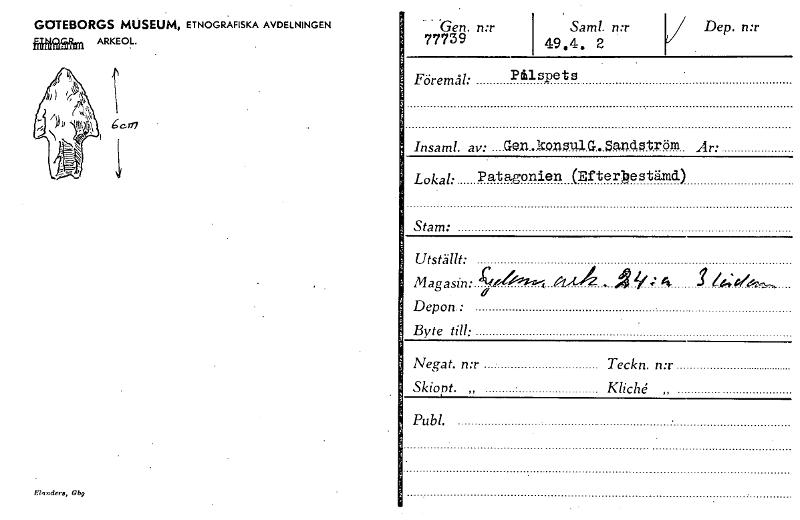 • GOTEBORGS MUSEUM, ETNOGRAFISKA AVDELNINGEN faffitm ARKEOL. Gen. n:r 77739 Samt n:r 49.4. 2 Dep. n:r Föremål: Palspets Insaml. av: Gen . konsul G. Sandström År: Lokal: Patagonien (Efterbestämd) Stam:... Visa hela