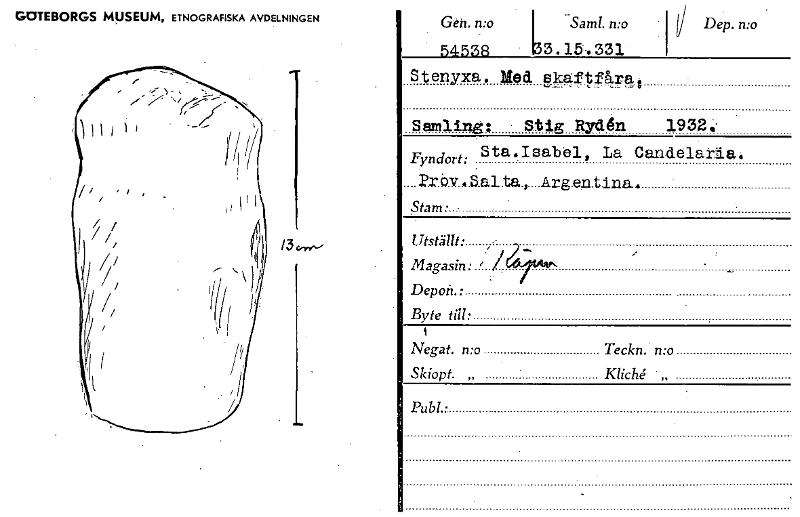 • GOTEBORGS MUSEUM, ETNOGRAFISKA AVDELNINGEN ._ Gen. n:o Saml. n:o Dep. mo 5453813 3.15.331 i Stenyxa. Med. ekäft !å.y9, , Samling; Stig Rydén 1932: Fyndort: Sta.Isabel, La Candelaida. Arg.entina. Stam ... Visa hela