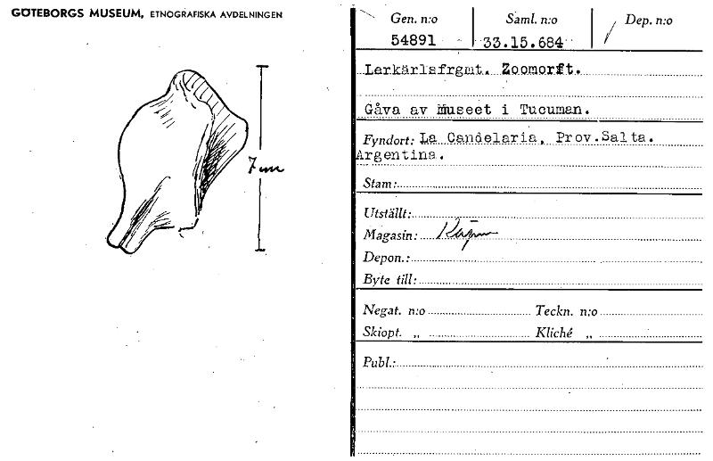 • 54891 1 33.15.684 Dep. n:o GOTEBORGS MUSEUM, ETNOGRAFISKA AVDELNINGEN Gen. n:o Sa- ml. n:o LarkäriEfrgmt. Zoamorft. Gåva av äuseet i Tueuman. Fyndort: 14a Candelaria, Prov.Salta. rgentina- Stam • Utst... Visa hela