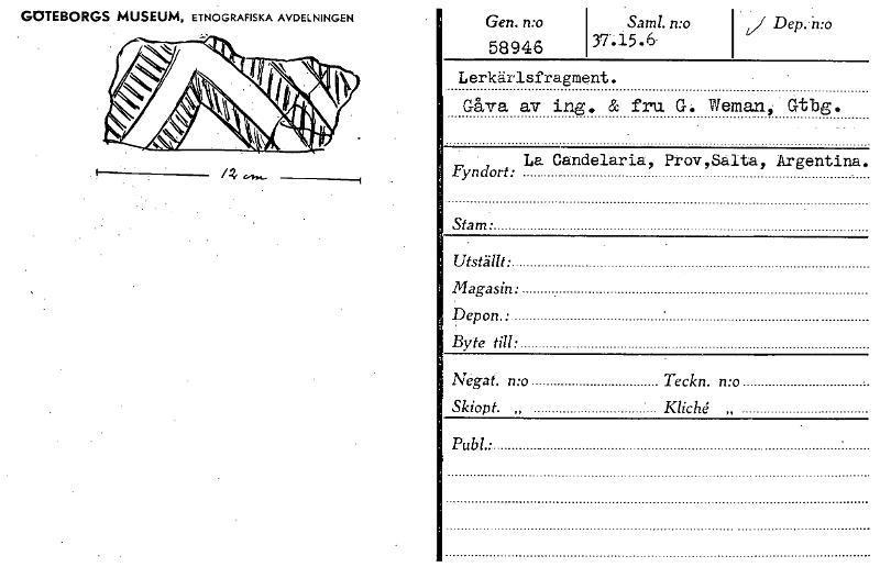 • GOTEBORGS MUSEUM. ETNOGRAFISKA AVDELNINGEN • 1 j Dep.'n:o Lerkärlsfragment. Gåva av ing. & fru G. Weman Gtbg. Fyndort: Stam • La Candelaria, Prov,Salta, Argentina. Utställt • Magasin • Depon.: Byte ti... Visa hela