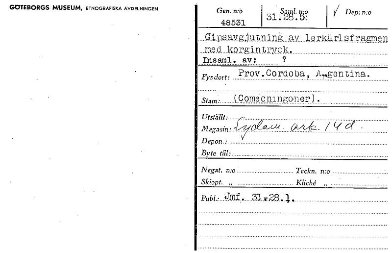 • GOTEBORGS MUSEUM, ETNOGRAFISKA AVDELNINGEN Gen. n..i) 48531 31.S ääl :räo I Dep:n:o Glpsavgjutninå av lerkärlstragmen Med korgintryck. Ins arra . av : ? :. Fyndort: Prov.Cordoba, Atigentina. Stam (C... Visa hela