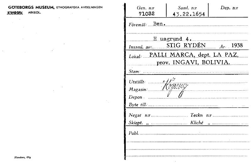 Gen. n:r 71032 Sam!. n:r Dep. n:r 43.22.1654 GOTEBORGS MUSEUM, ETNOGRAFISKA AVDELNINGEN xfflgec ARKEOL. Föremål: Ben. H uegrund 4. Insaml. av • STIG RYDÉN Ar 1938, Lokal: Stam: PALLI MARCA, dept. LA PAZ prov. INGAVI, BOLIVIA. Utställt: Magasin: Depon Byte till: Negat n:r Teckn n:r Skiopt. „ Kliché „ Pub!. 615, Elanders, Obg [ocr]