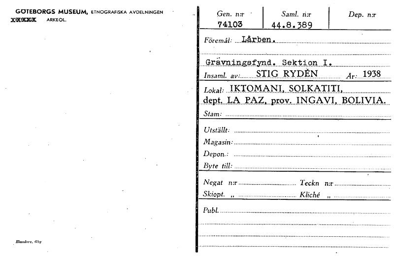 Manders. G1+9 Gen. n:r • 74103 Saml. n:r 1 44.8.389 Dep. n:r Föremål: Lårben. Grävnin gpfynd. Sektion I. Insaml. av: STIG RYDÉN Ar: 1938 Lokal: IKTOMANI, SOLKATITI, dept. LA PAZ,...prov. INGAVI, BOLIVIA. Stam: Utställt: , Magasin: Depon.: Byte till: ' Negat n:r Teckn n:r • Skiopt. „ Kliché „ Publ. • GOTEBORGS MUSEUM, ETNOGRAFISKA AVDELNINGEN XUEGLIGX ARKEOL. [ocr]