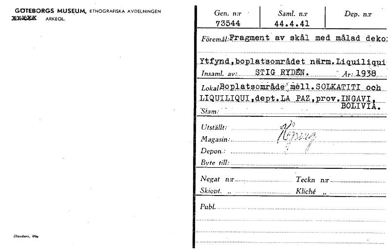 GOTEBORGS MUSEUM, ETNOGRAFISKA AVDELNINGEN XXIX.« ARKEOL. INandere, Gt«, Gen. n:r . 73544 Sam!. n:r i 44.4.41 Dep. n:r • Föremål:Fragment. av skål med målad deko: It.f.ynd ,boplatSområdet närm. Liquiliqui. Insaml. av: STIG RYDÉN. - År: 19.3.8. Lokali3op1at501nråde'iMell . SOLICATITI 004 LIQUILIQUI I dept . LA PAZ ,prov.INGAVI Siam:- - - . 30LIVII. Utställt: 4./9 Magasin: Depon.: ' !/ Byte till: Negat n:r Teckn n:r Skiopt. „ Kliché Publ. • [ocr]