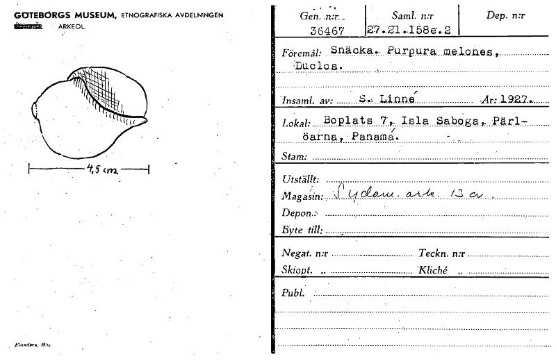 • GOTEBÖRGS MUSEUM, ETNOGRAFISKA AVDELNINGEN itliffität.• ARKEOL. Gen. 36467 Samt. n:r 27.21 ...158e. 2 Dep. n:r .14 5" on —I Föremål: Snäcka.. Purpur& at.elon.e.s., :Duc 1o. Insaml. av: S Linne -År... Visa hela