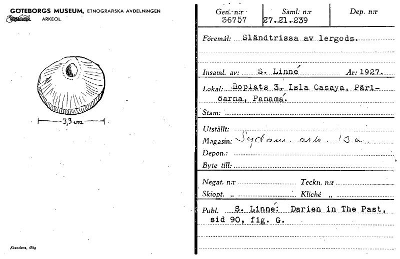 GOTEBORGS MUSEUM, ETNOGRAFISKA AVDELNINGEN ARKEOL. Gen. • n:r 36757 Sam!. n:r .7.21.239 Dep. n:r Föremål: Sländ.tris.s.a av .1.ergo_ds. r Insaml. av: S. I.lxm.e År: 19.27— Lokal: '15-'oplats 3, isla easaya, Pari- öarna, Panama/. Stam: Utställt: Magasin: CkA Depon.• Byte till: Negat. n:r Teckn. n:r Skiopt. „ Kliché Publ. S. Linne: Darien in The Fast, sid 90, fis.. G. laa>grier., Gb9 [ocr]