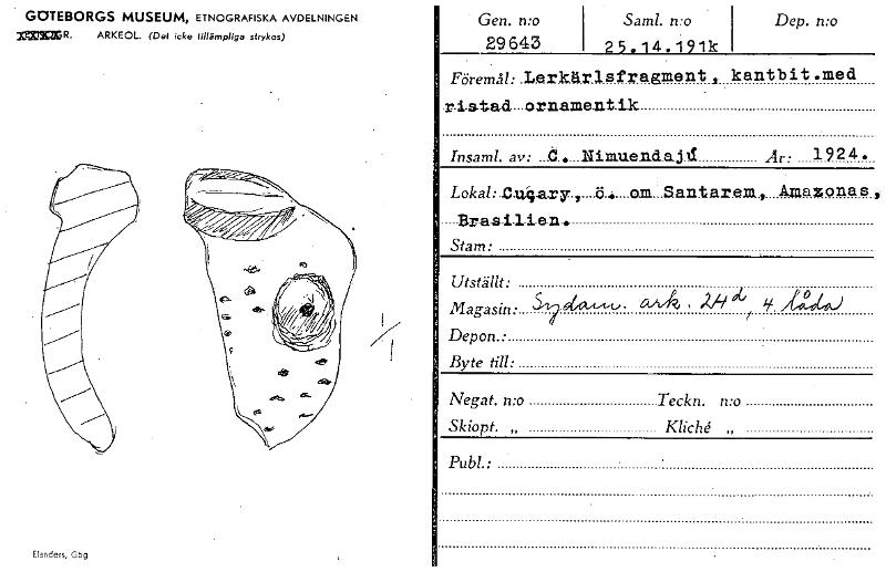 • GOTEBORGS MUSEUM, ETNOGRAFISKA AVDELNINGEN xextsalGR. ARKEOL. (Det icke tillämpliga strykes) Elanders, Gbg Gen. n:o 29643 Sam!. n:o 25.14.191k Dep. mo Föremål: .Lerktkris fragment kantbit .med x-i-sta... Visa hela