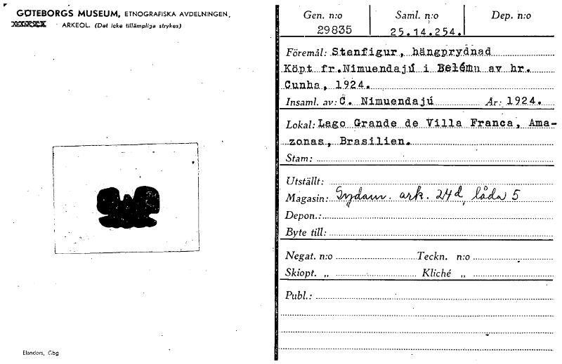 GOTEBORGS MUSEUM, ETNOGRAFISKA AVDELNINGEN. XeratkX ' ARKEOL. (Det icke tillämpliga strykes) Elanders, Gin Gen. n:o 29835 Sand. no 25.14.254. Dep. ii:o Föremål: .Stenfigur.,....b.angpxydna d .1(ö.p.t....