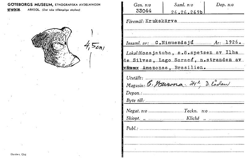GOTEBORGS MUSEUM, ETNOGRAFISKA AVDELNINGEN NIMGA. ARKEOL. (Det icke tillämpliga strykas) Elu■ders, Gbg Gen. mo 33044 Saml. mo . 26.26.269b Dep. n:o , Föremål: Kr.u.k.e.k.ä.rv a , , Insaml. av: C...N.inrue.nd.a.A. Är: 1926. 'lila P kli= ...Amazo.na.s.,...Brarsillen. Utställt: Magasin: ~2-,_ ' / Depon.• Byte till:. Negat. n:o Teckn mo Skiopt. „ Kliché „ Publ.• ! , .. , ' [ocr]