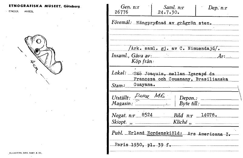 ETNOGRAFISKA MUSEET, Göteborg ETNOGR. ARKEOL. Gen. n:r I Saml. n:r 26776 I .24.7.30. Dep.' n:r Föremål: __Hängprydnad_ av grågrön sten. /Ark. saml. gj. av C. Nimuendajil Insaml., Gåva av: Är: • Köp från: Lokal: Joaquim, inJlanIgar.ap44a Franceza och Couanany, Brasilianska Stam: Guayana. Utställt: /14, Magasin: Depon.: Byte till: Negat. n:r_ 8524 Bild n:r 14078. Skiopt. „ KlicU „ Publ. __Er la m N_ordenskiölcl: Ars Ame-r4oana-4-.--1- _Paris 1430, pl. 39 f. .ELANDERS. GOG. 5687. 8.61. [ocr]Stäng